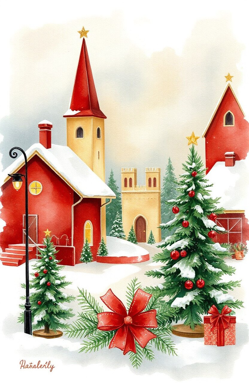 Bright reds, greens, and golds come together to create a festive spirit. Holiday scenes are perfect for Christmas or seasonal greetings.