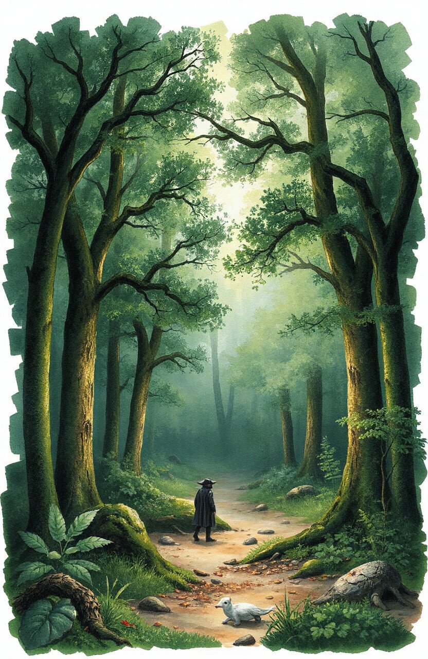 The deep greens and mysterious shadows create a sense of magic and adventure.
