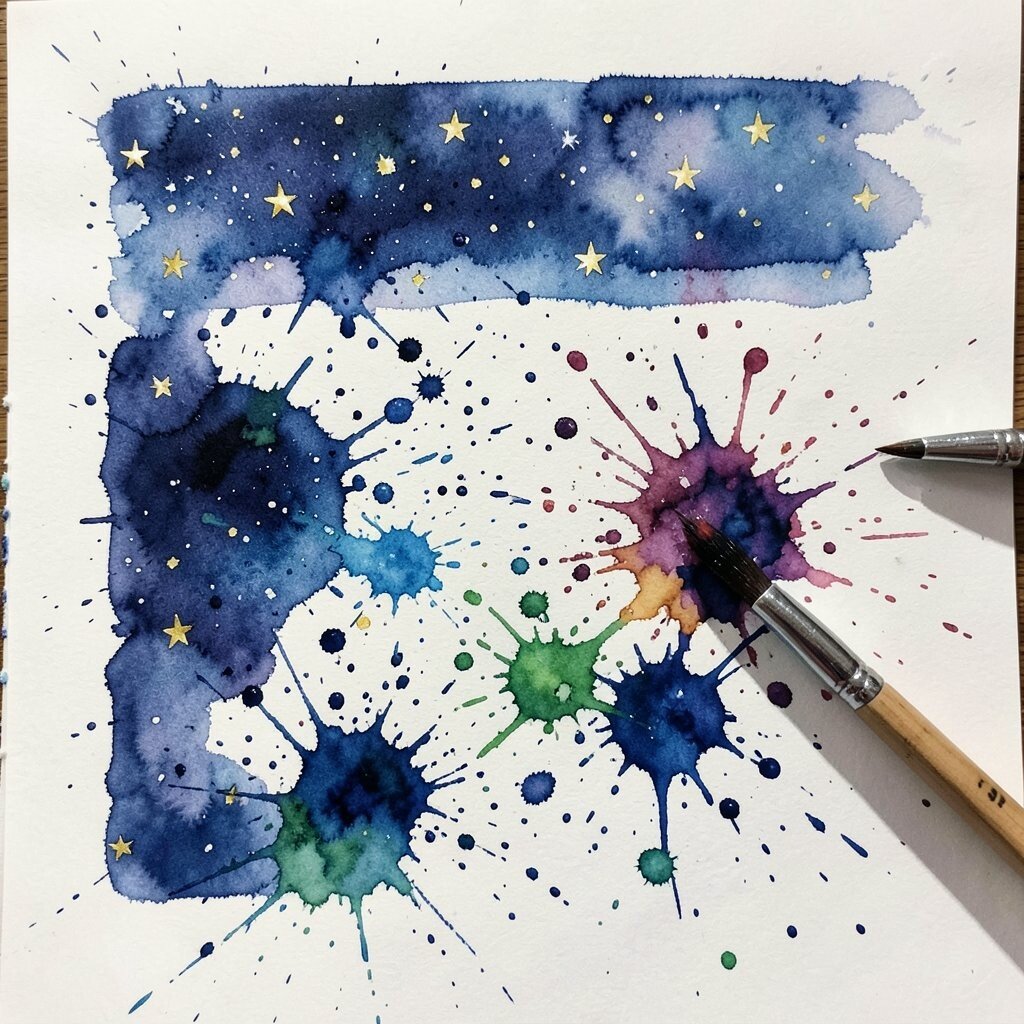Dip your brush in paint and flick it onto your paper to create a random splatter effect. It’s messy, fun, and adds a sense of spontaneity to your work. Use it for stars in a night sky or to add energy to a scene.