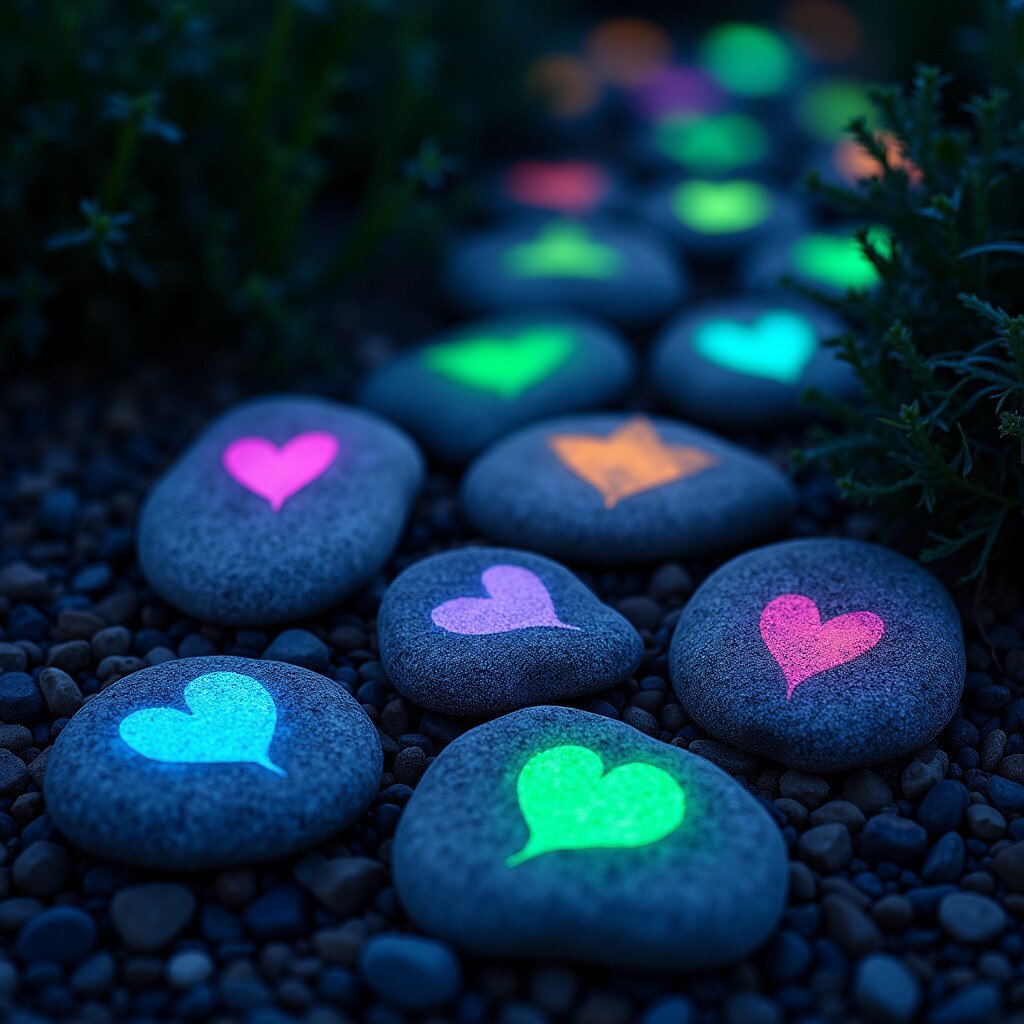Light up the night with glow-in-the-dark stones. These stones are painted with special glow paints, making them shine when the lights go out. They are perfect for adding magic to your garden or pathways.