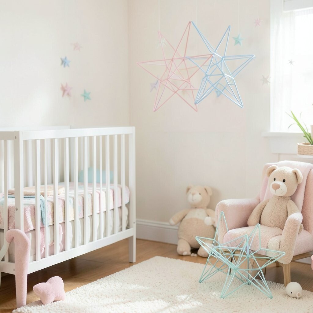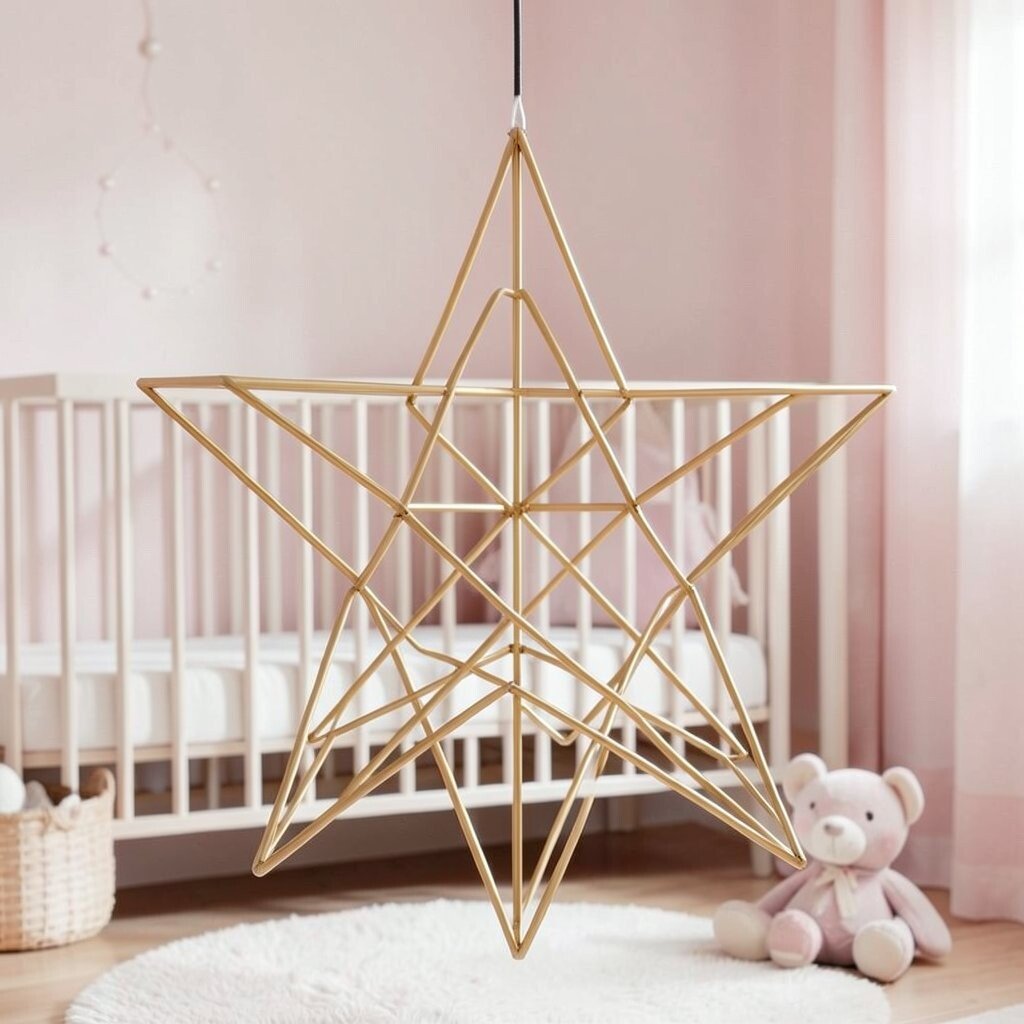 The geometric wire star adds a modern twist to traditional nursery decor. Its sharp lines and angles create a striking contrast with soft nursery elements. It’s perfect for adding visual interest.