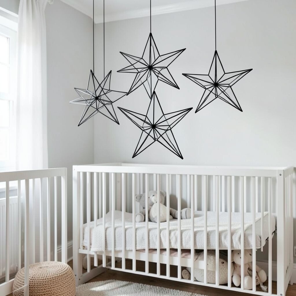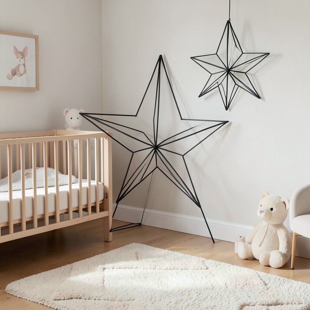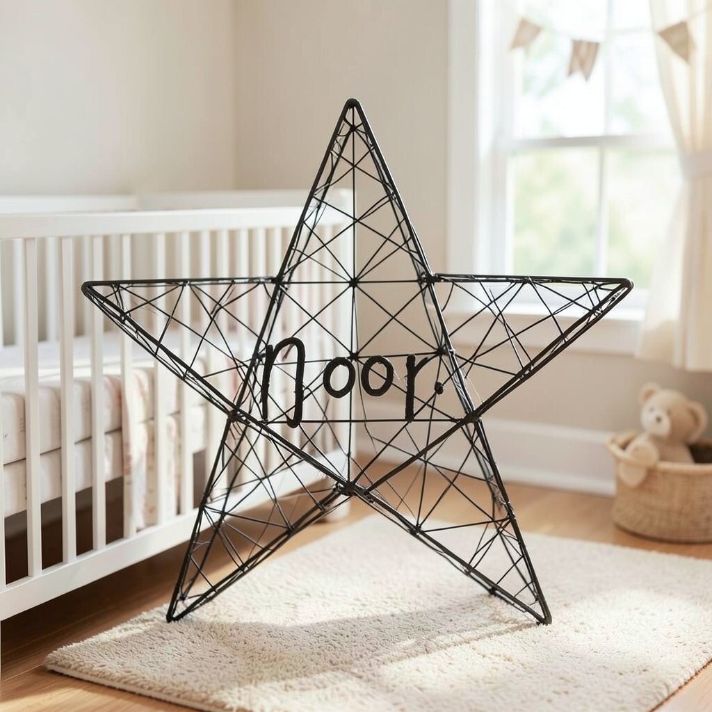 For fans of minimalism, a black wire star is a striking choice. It’s sleek, simple, and adds a bold statement to the nursery. This star is perfect for modern and monochrome themes.