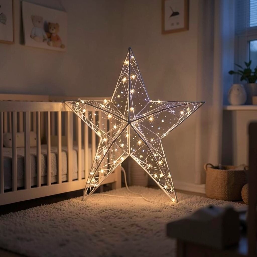 An ethereal white wire star brings a sense of calm and serenity to the nursery. It’s ideal for creating a peaceful atmosphere. This star is perfect for a clean, airy aesthetic.