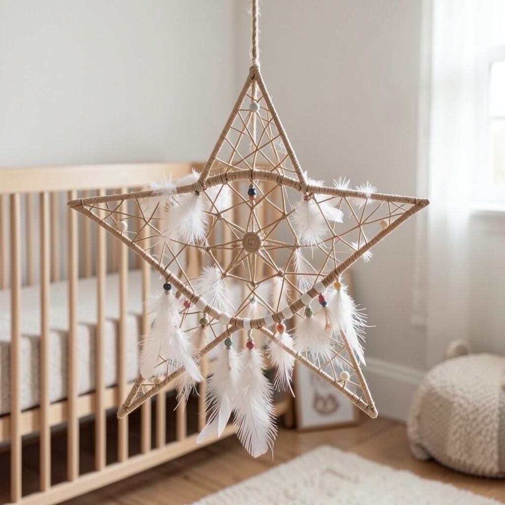 Combine the classic dreamcatcher with a star shape for a boho-chic look. It’s perfect for capturing sweet dreams in the nursery. This star is trendy and unique.