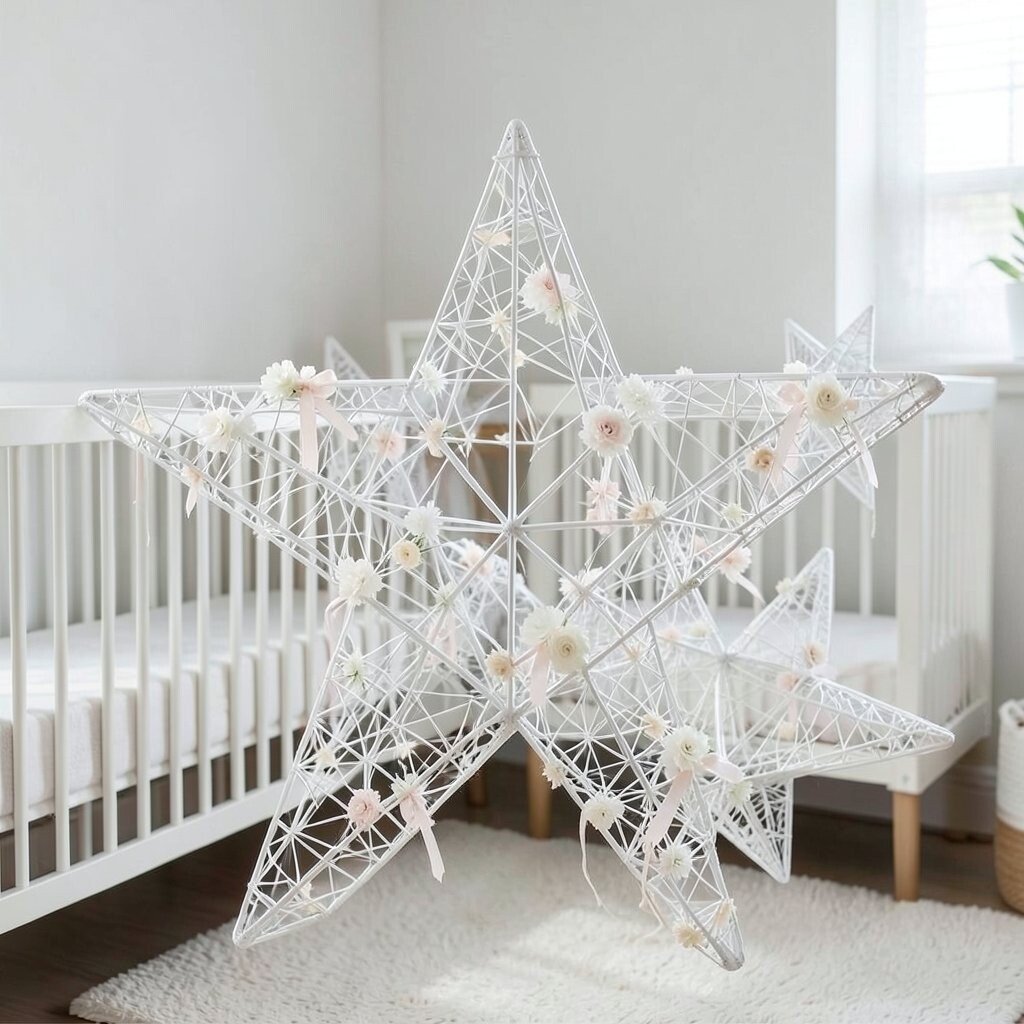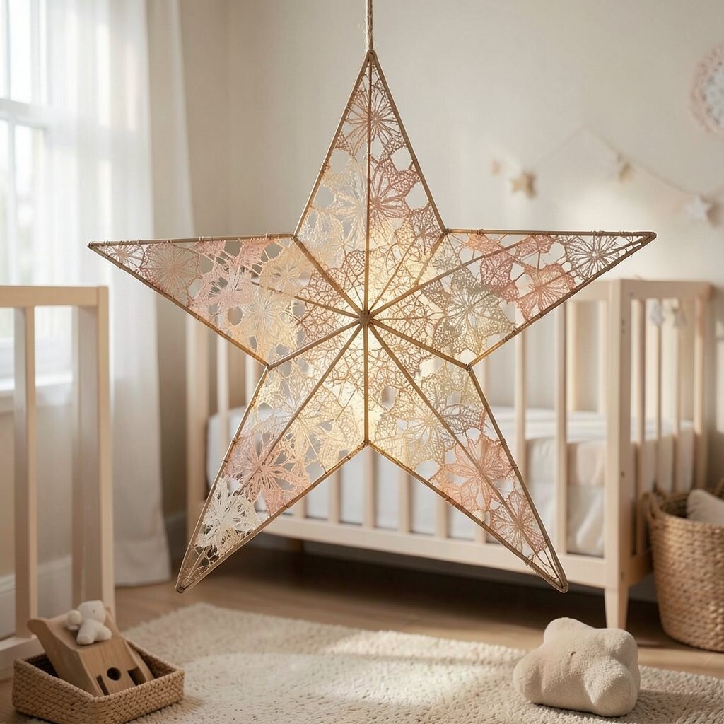 A lace-covered wire star adds a touch of delicacy and elegance. It’s perfect for a soft, romantic nursery theme. The lace creates beautiful patterns when the light shines through.