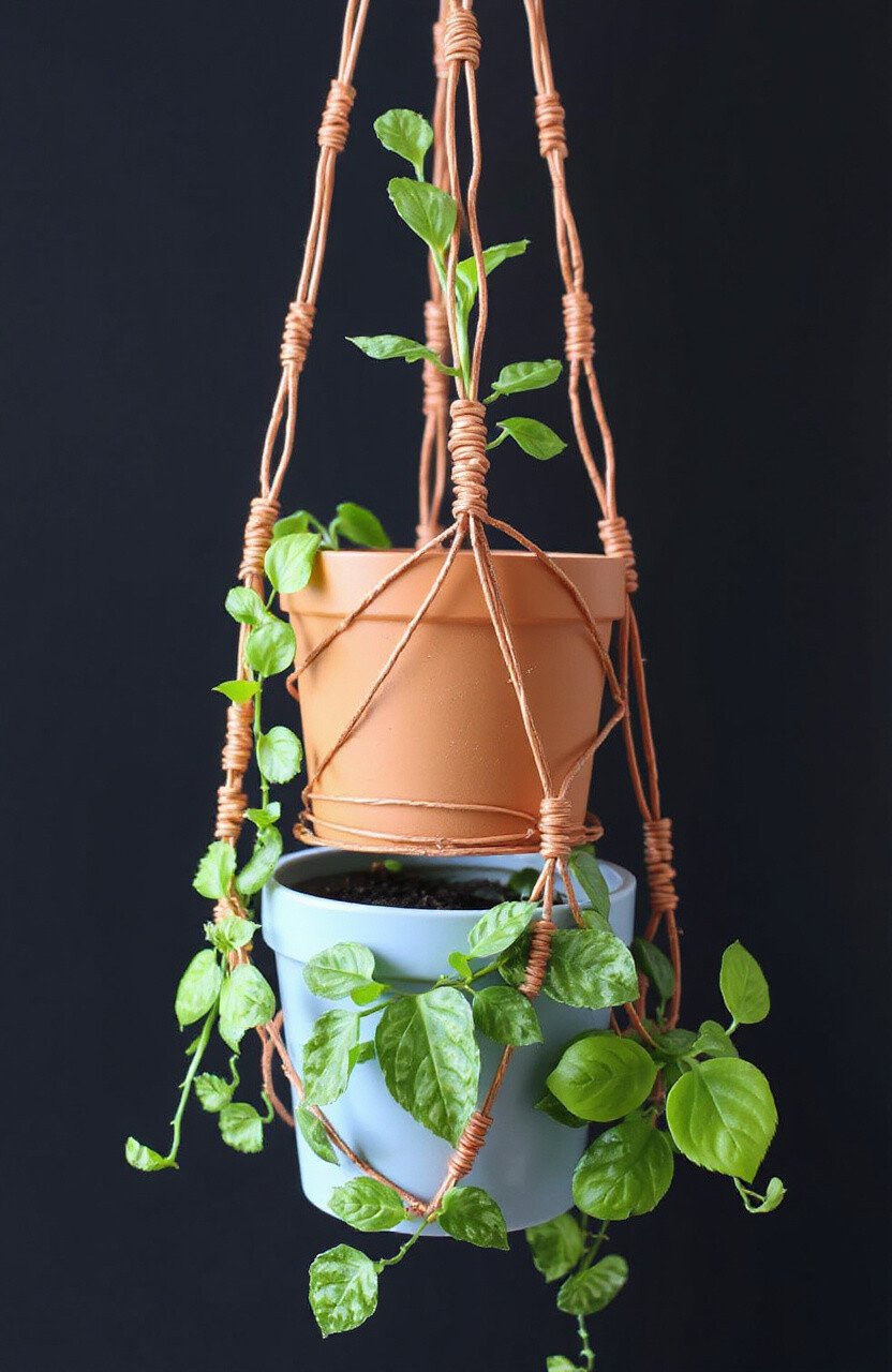 Give your plants a stylish home with wire wrapped plant hangers. The wire can twist and turn to hold pots securely. It’s a creative way to display your greenery.