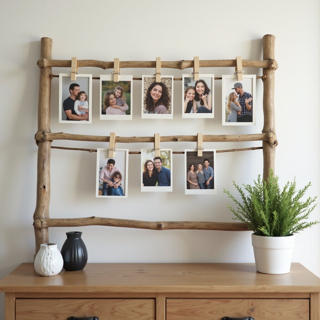 Small ladders can be made from twigs, dowels, or reclaimed wood. Secure the rungs with nails or glue, and use small clips to attach photos. This display offers flexibility, allowing you to change out photos easily, and adds a touch of farmhouse charm to any space.