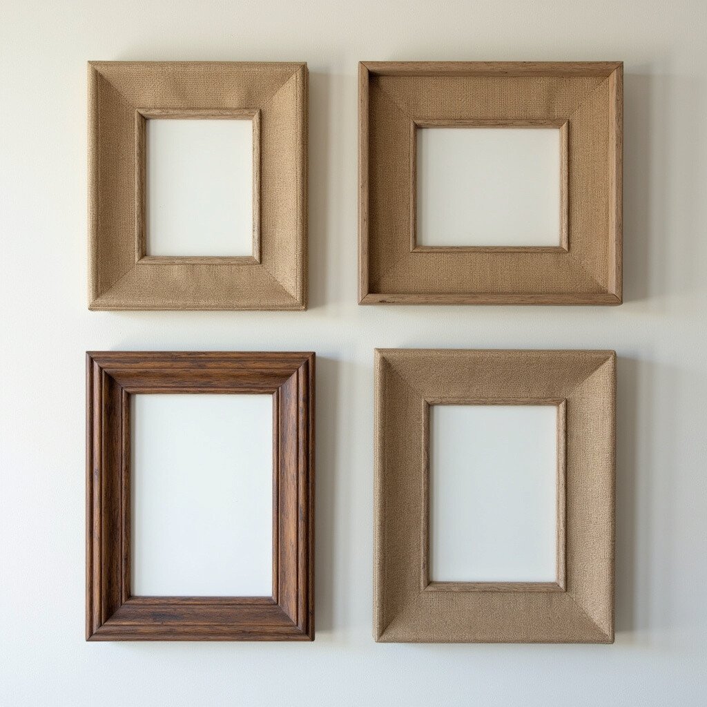 Burlap frames add a touch of texture. The combination of wood and burlap creates a unique look. Perfect for farmhouse or shabby-chic themes.