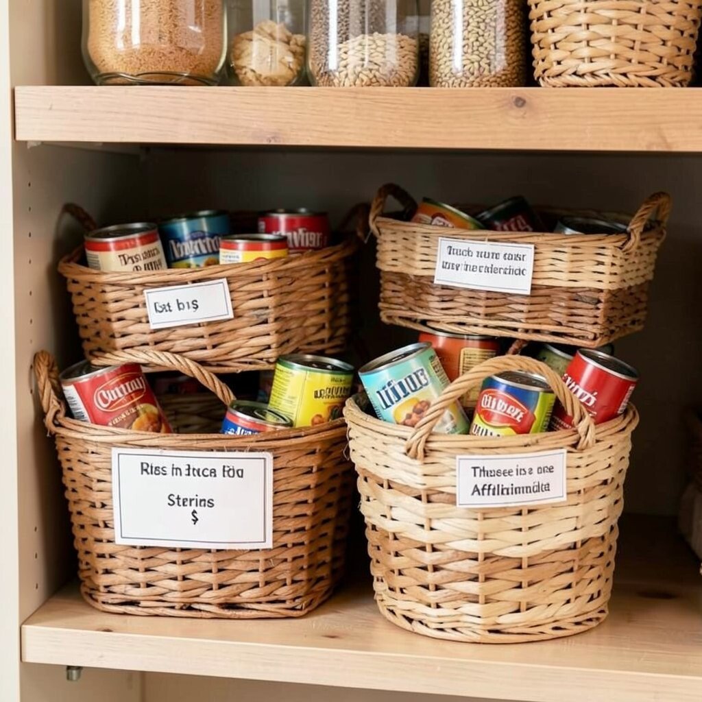 Transform your pantry with woven baskets to store snacks, cans, and dry goods. It makes everything easy to find and looks absolutely stunning.