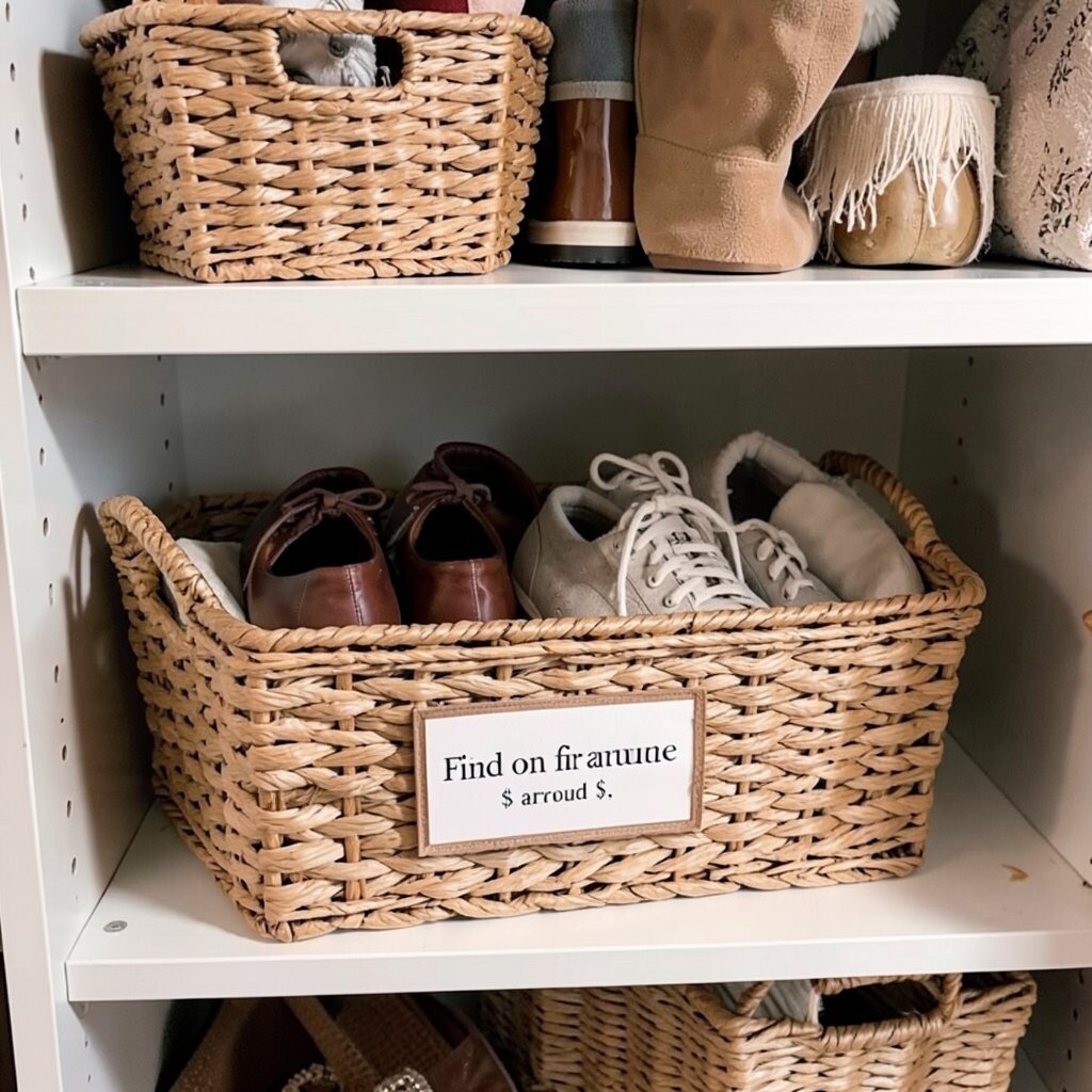 Keep your closet floor tidy by storing shoes in a woven basket. It’s a chic way to organize and protects your footwear from dust and scratches.