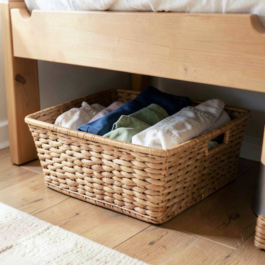 Make use of the space under your bed with a flat woven basket. Store seasonal clothing or spare linens out of sight but within reach.