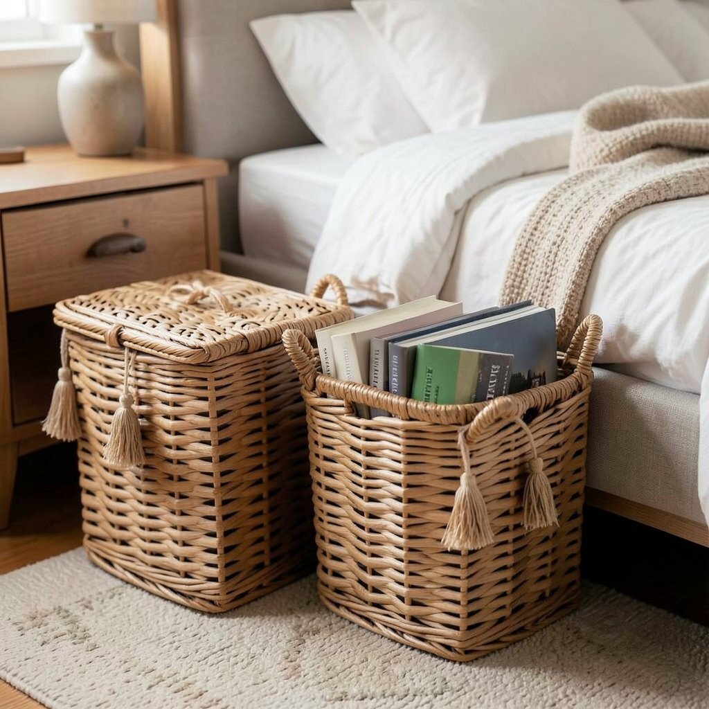 For book lovers, a woven basket next to your bed can hold your nighttime reads. It keeps your books organized while adding a cozy touch to your personal sanctuary.