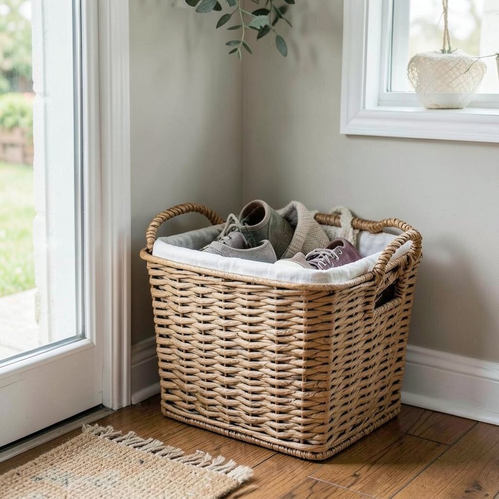 Welcome guests with a tidy entryway by storing shoes in a woven basket. It’s both functional and adds a rustic charm.