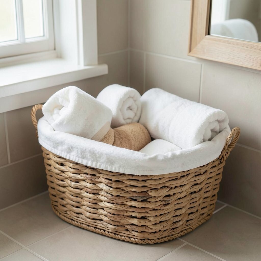 Roll up your towels and store them in a large woven basket for a spa-like bathroom. It’s a simple way to keep everything organized while adding a touch of luxury.