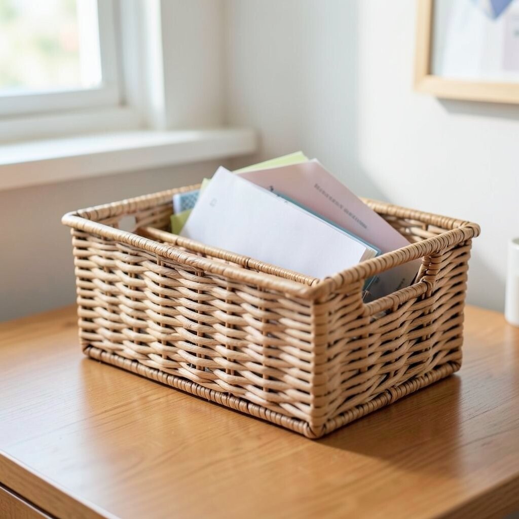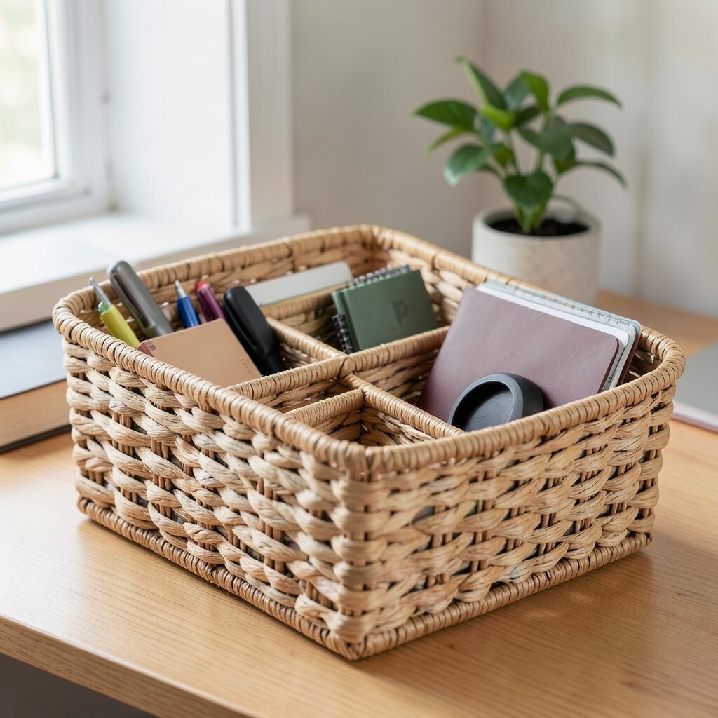 Transform your workspace with a woven basket to keep office supplies tidy. Pens, notepads, and even your planner can find a home here, adding a natural element to your desk.