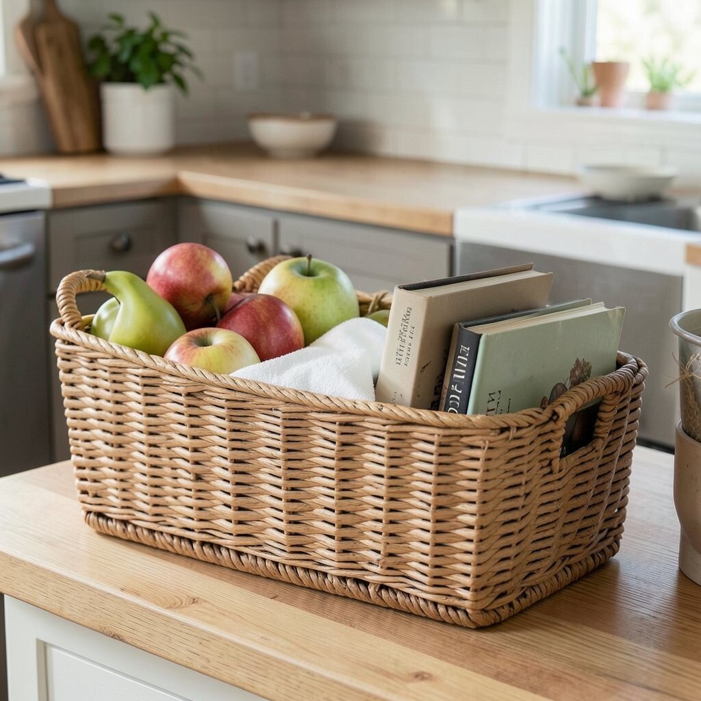 Keep your kitchen counters tidy with a charming woven basket. Perfect for holding fruit, kitchen towels, or even your favorite cookbooks. It adds a rustic charm that complements any kitchen style.