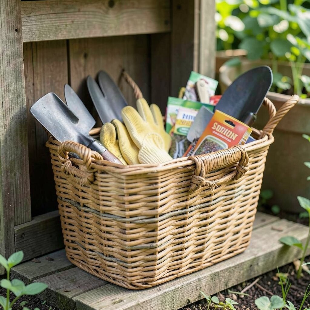 Keep your garden tools handy with a woven basket. It’s perfect for storing gloves, trowels, and seed packets, and it adds a rustic touch to your garden shed.