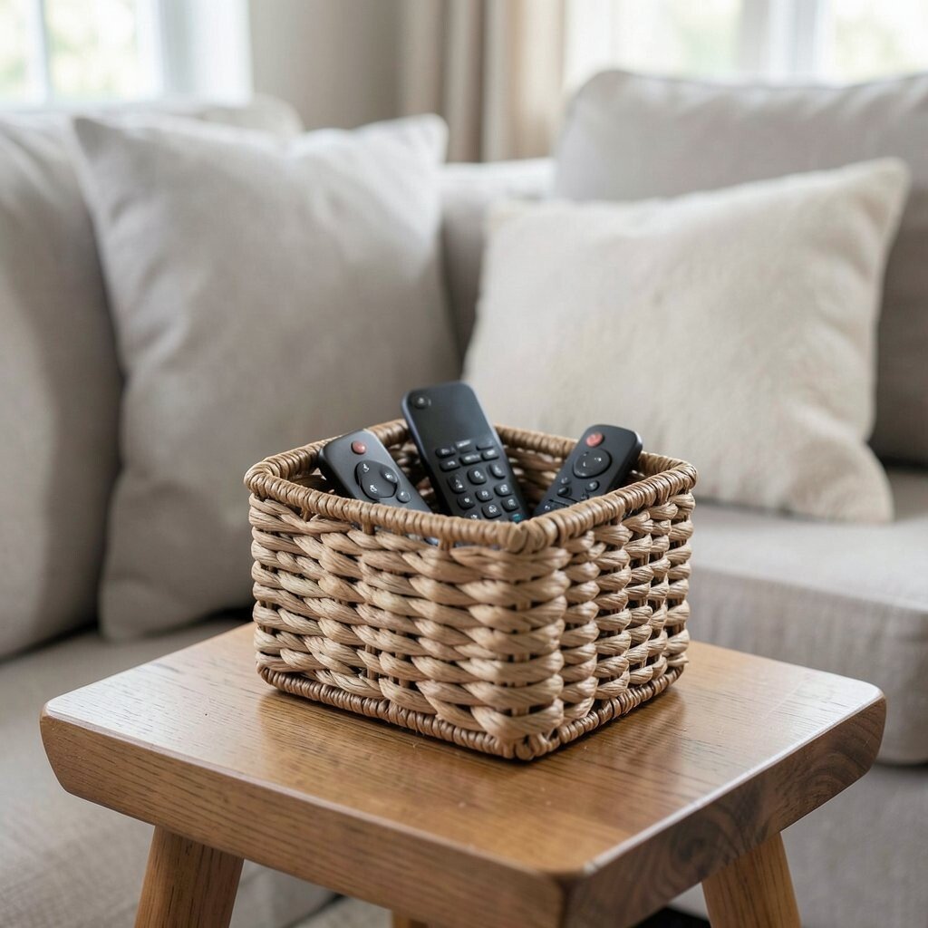 Keep your remotes and other small gadgets organized in a small woven basket. It’s a stylish addition to your living room that keeps everything within reach.