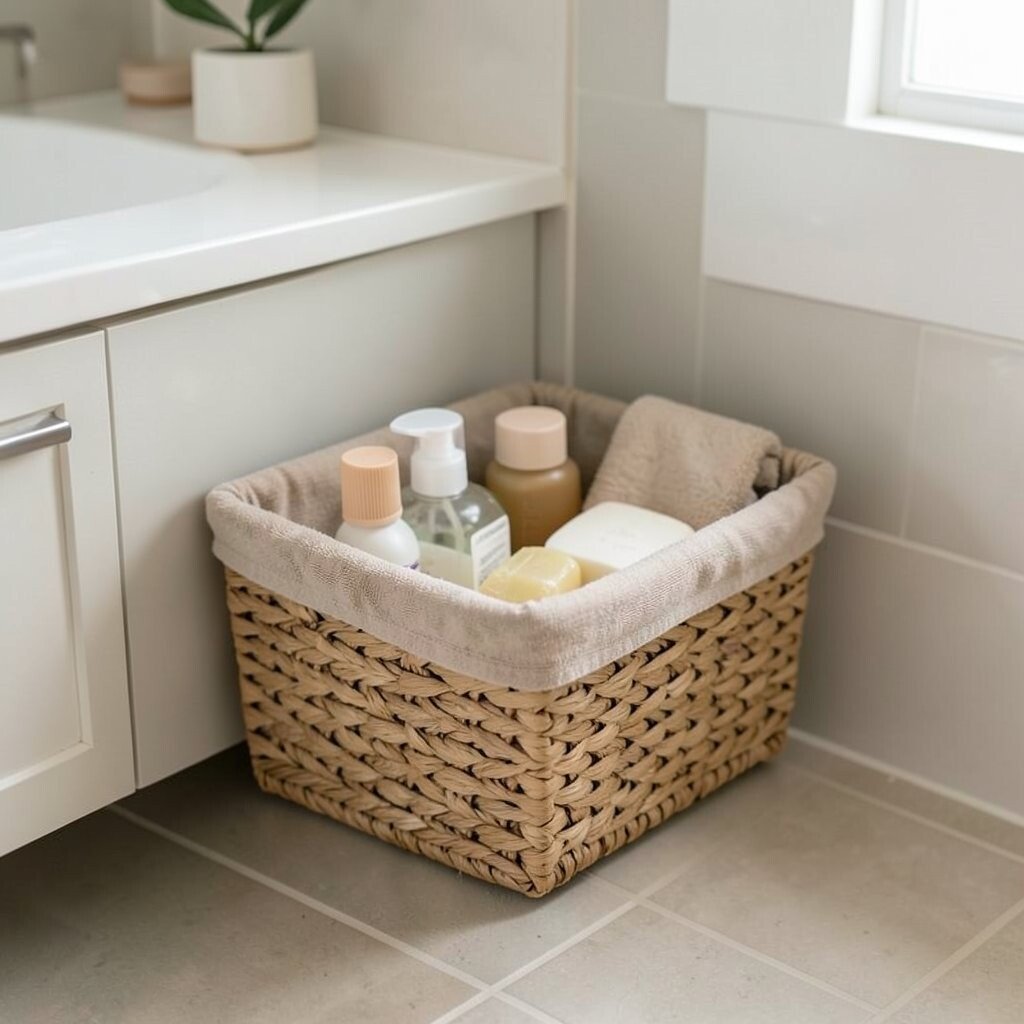 Choose a basket with a liner to protect from moisture. Opt for neutral colors to keep the look serene, with prices around $10 to $25.