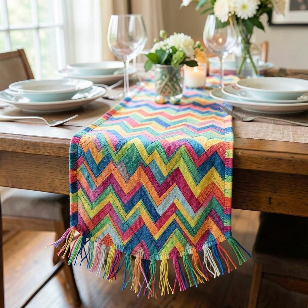 A zigzag stitched table runner can instantly brighten up your dining area. The vibrant patterns add a touch of elegance and fun to your table setting. Choose colors that complement your dinnerware for a cohesive look.